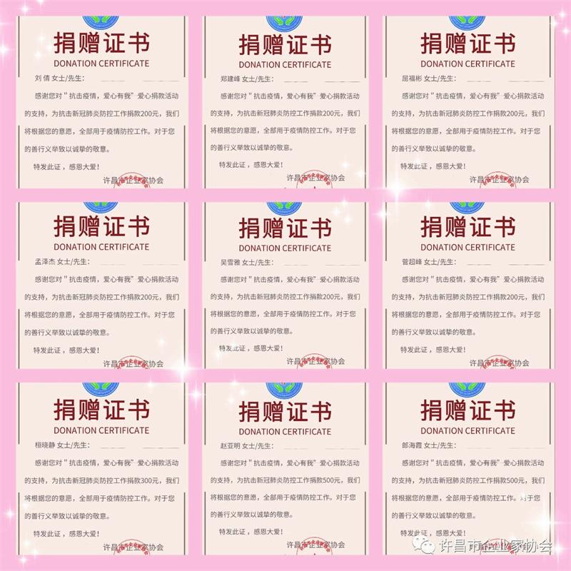 3月6日,許昌市企業(yè)家協(xié)會為積極參與“抗擊疫情,愛心有我”捐款活動的會員單位在線頒發(fā)《捐贈證書》,對企業(yè)家們的善行義舉致以誠摯的敬意!