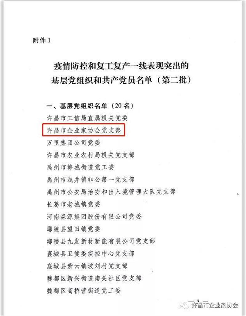 3月11日,許昌市企業(yè)家協(xié)會黨支部榮登中共許昌市委組織部《關(guān)于對疫情防控和復(fù)工復(fù)產(chǎn)一線表現(xiàn)突出的基層黨組織和共產(chǎn)黨員進(jìn)行進(jìn)行表揚(yáng)的通告》第二批。