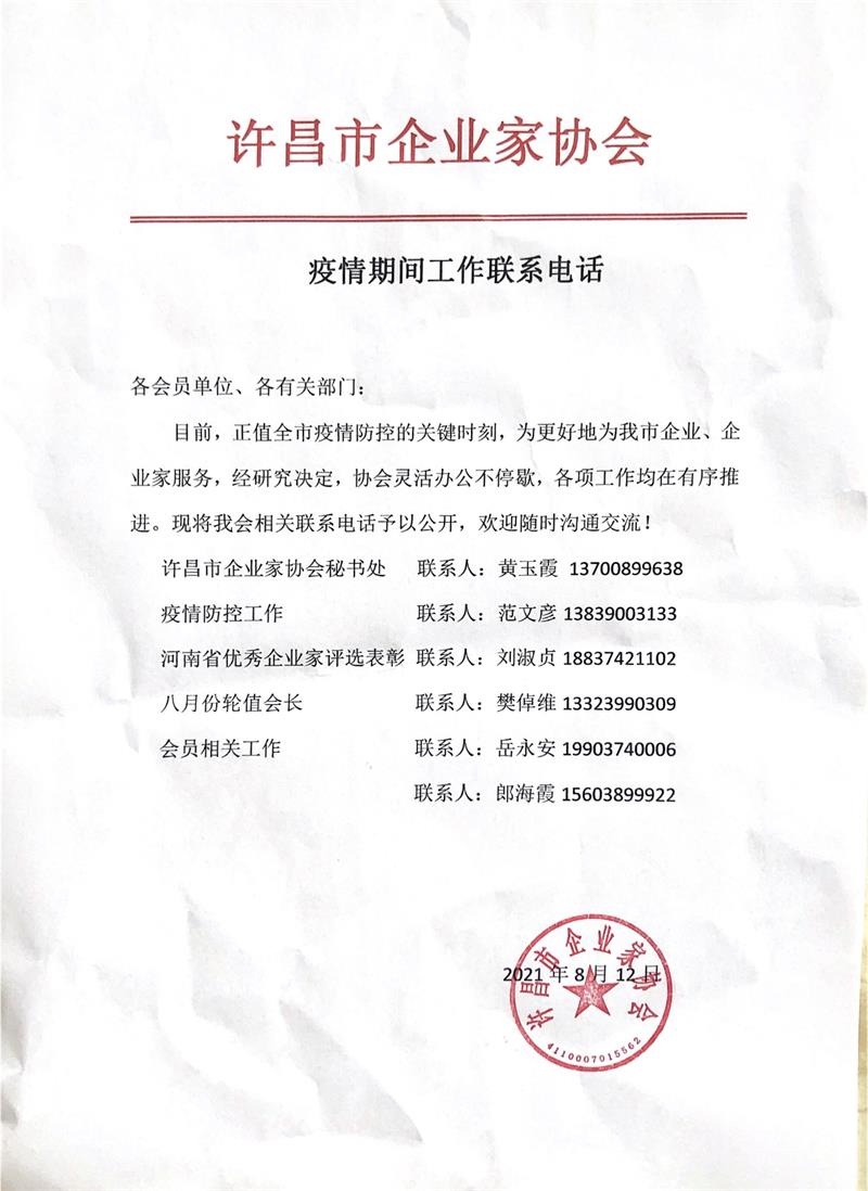 8月12日,為更好服務(wù)我市企業(yè)、企業(yè)家,協(xié)會(huì)靈活辦公不停歇,協(xié)會(huì)將相關(guān)聯(lián)系電話予以公開,歡迎隨時(shí)溝通交流!