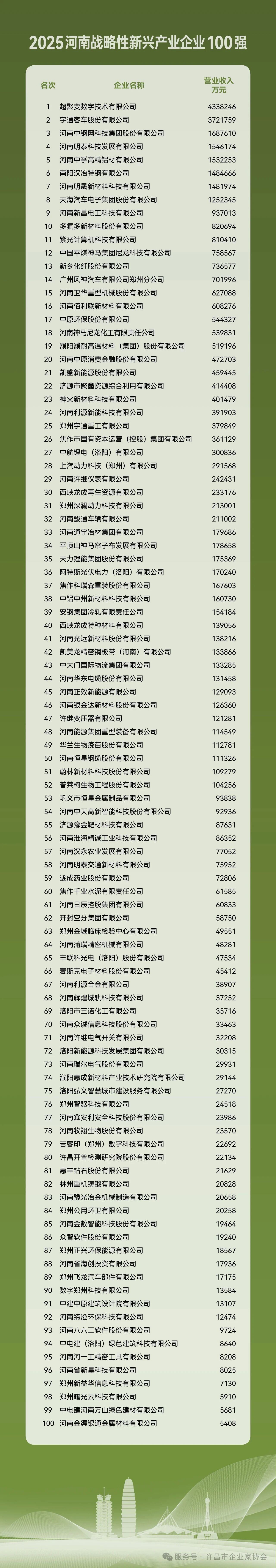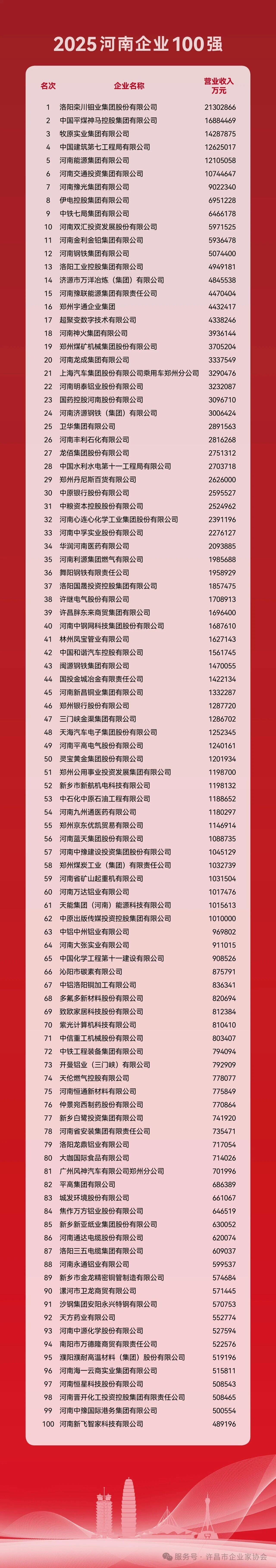 據(jù)了解,省企聯(lián)已連續(xù)第21年以企業(yè)營業(yè)收入為依據(jù),遵循國際通行規(guī)則,發(fā)布河南企業(yè)100強(qiáng)榜單,并連續(xù)第5年發(fā)布河南制造業(yè)企業(yè)100強(qiáng)、河南服務(wù)業(yè)企業(yè)100強(qiáng)榜單,以及第2年發(fā)布河南高成長性企業(yè)100強(qiáng)、河南戰(zhàn)略性新興產(chǎn)業(yè)企業(yè)100強(qiáng)榜單,全面展現(xiàn)我省企業(yè)的發(fā)展實力與結(jié)構(gòu)變化。