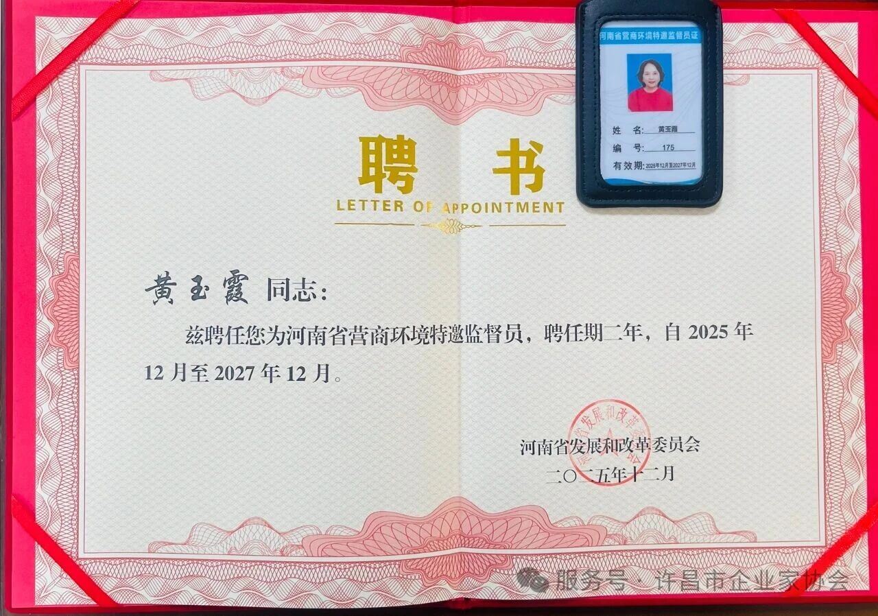 近日,河南省發(fā)展和改革委員會正式公布2025-2027年河南省營商環(huán)境特邀監(jiān)督員聘任名單,許昌市企業(yè)家協(xié)會秘書長黃玉霞成功入選,擔任新一屆特邀監(jiān)督員。